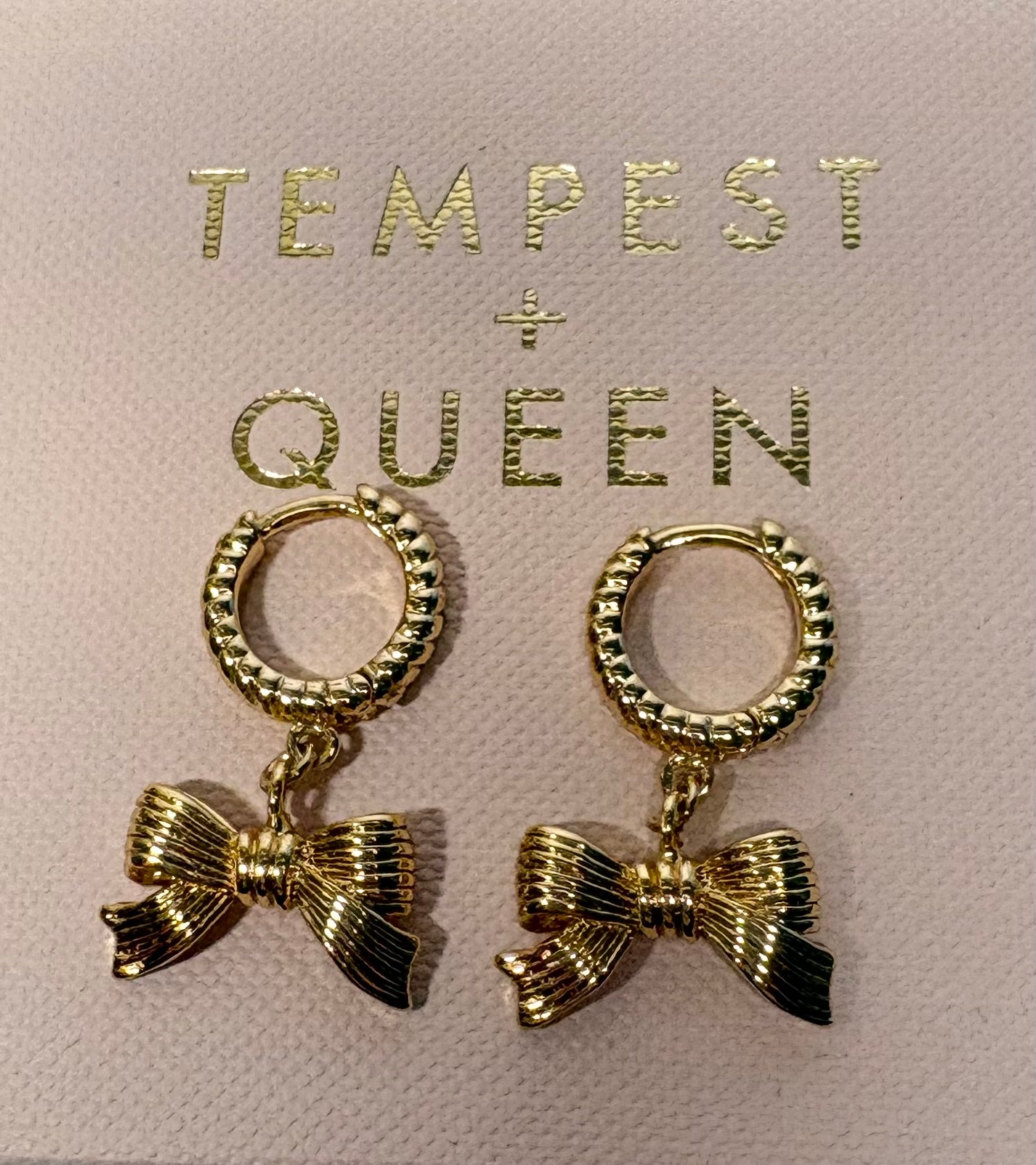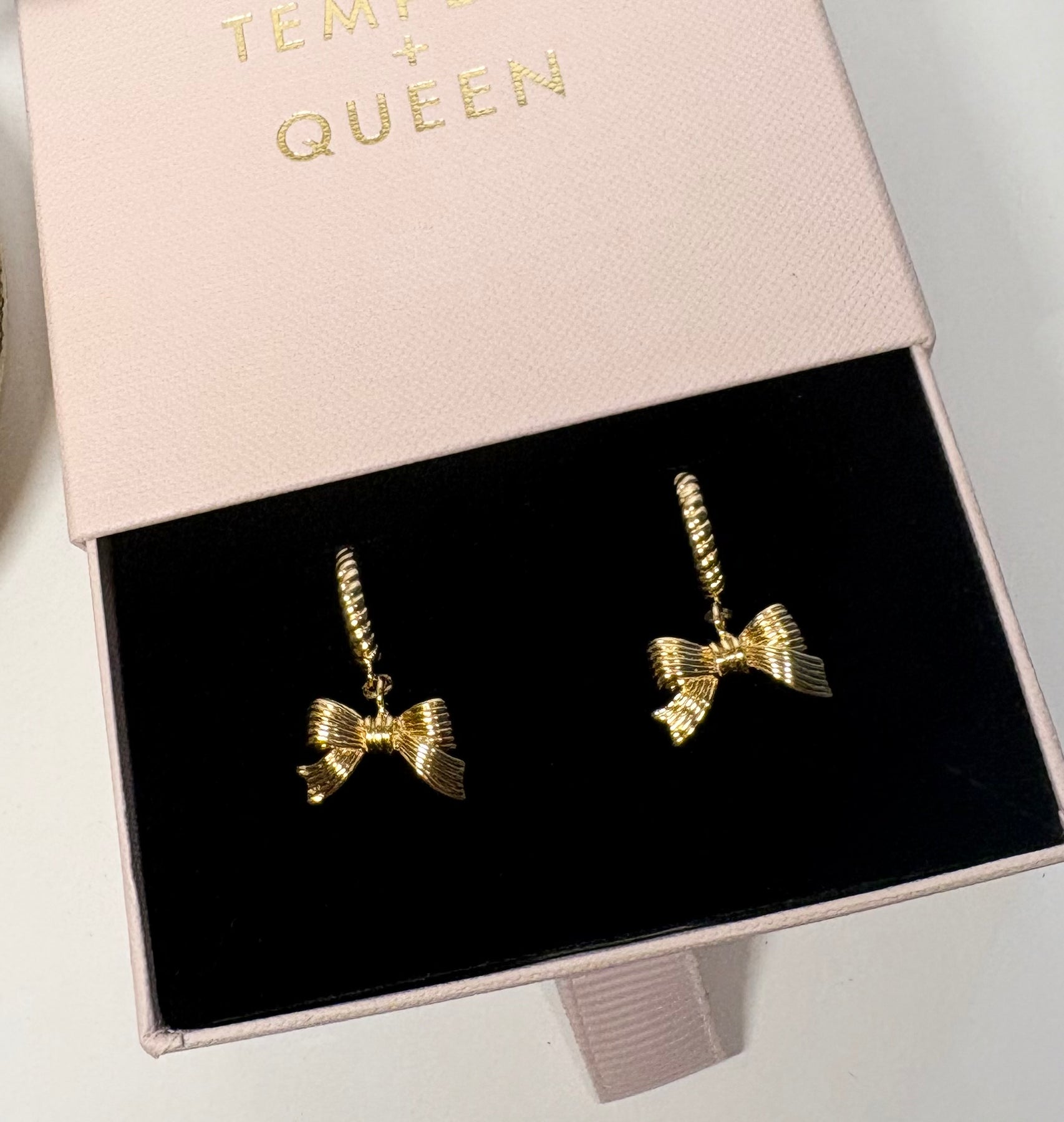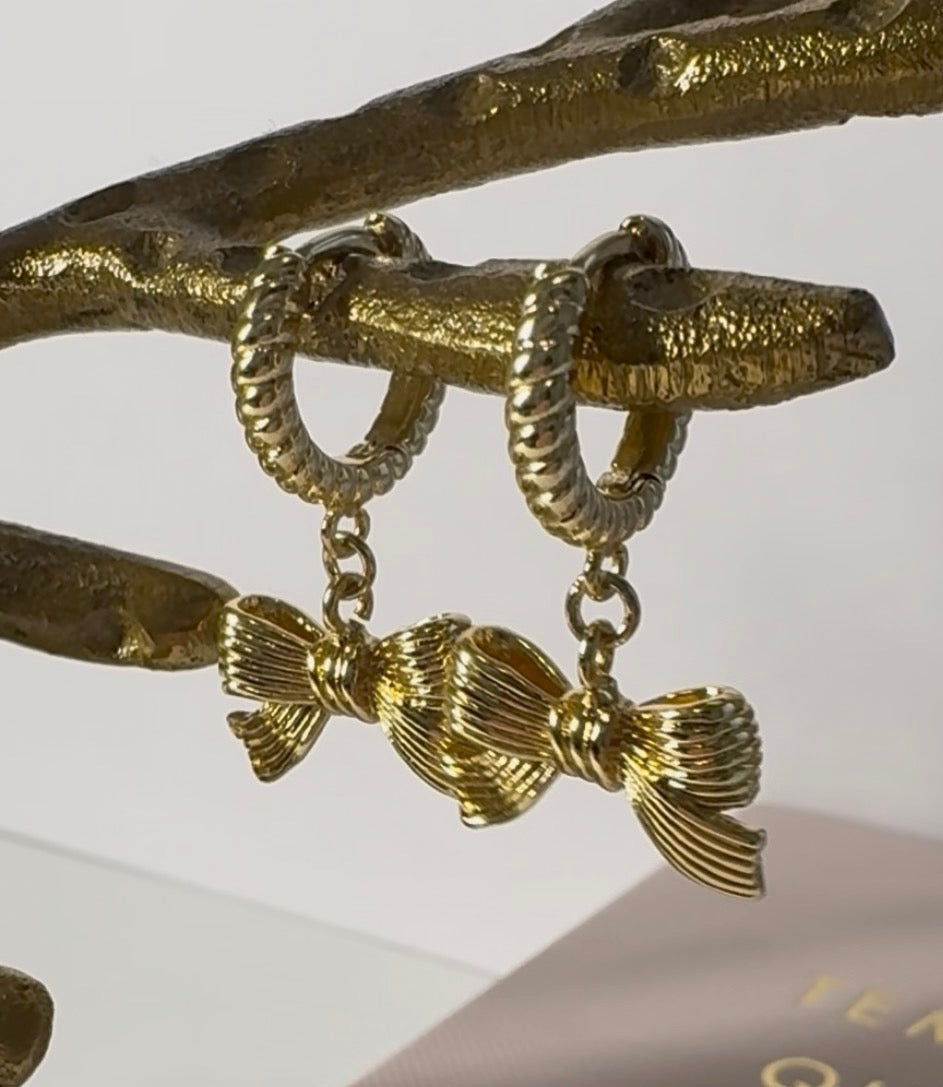 Elevate your everyday style with these elegant Ribbon Bow Huggies — designed to bring a touch of charm and timeless luxury to any outfit. Featuring beautifully sculpted ribbon bow charms and textured hoops, this pair offers a delicate yet eye catching shine that complements both daily wear and special occasions.
